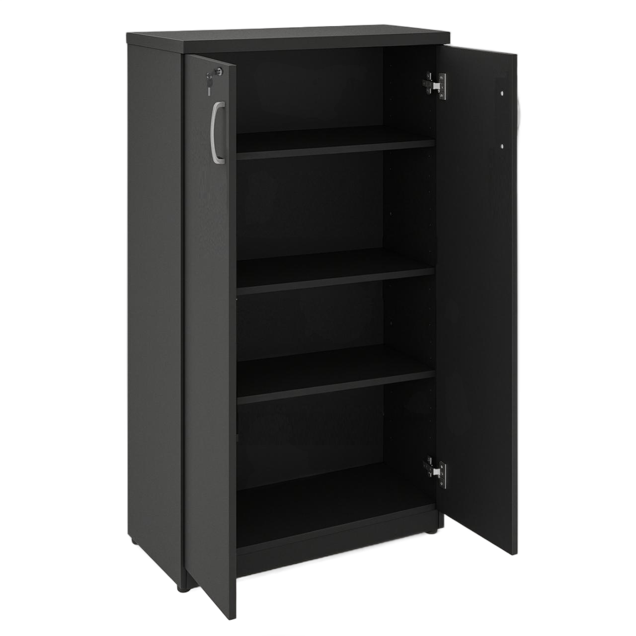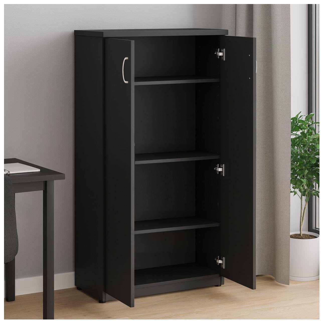 Armário de escritório compacto e funcional, desenvolvido para organização de documentos, materiais e objetos diversos. Possui design moderno, acabamento sofisticado em preto e estrutura reforçada para uso diário em ambientes corporativos, residenciais ou institucionais.