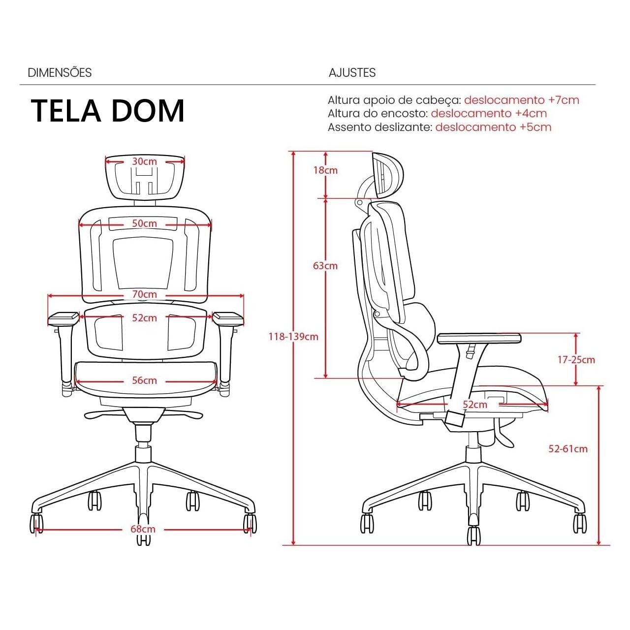 • Encosto, assento e apoio de cabeça em tela mesh de alta resistência, com excelente ventilação e conforto térmico.