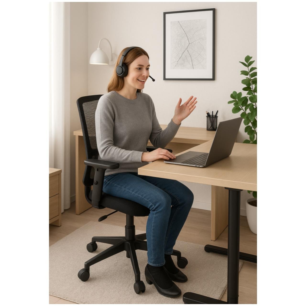 Cadeira ergonômica de uso profissional, ideal para ambientes corporativos, operacionais e escritórios em geral. Equipada com encosto em tela mesh, mecanismo Back System com ajuste de inclinação e altura, e dimensões adequadas para atender à Norma Regulamentadora NR 17 do Ministério do Trabalho.