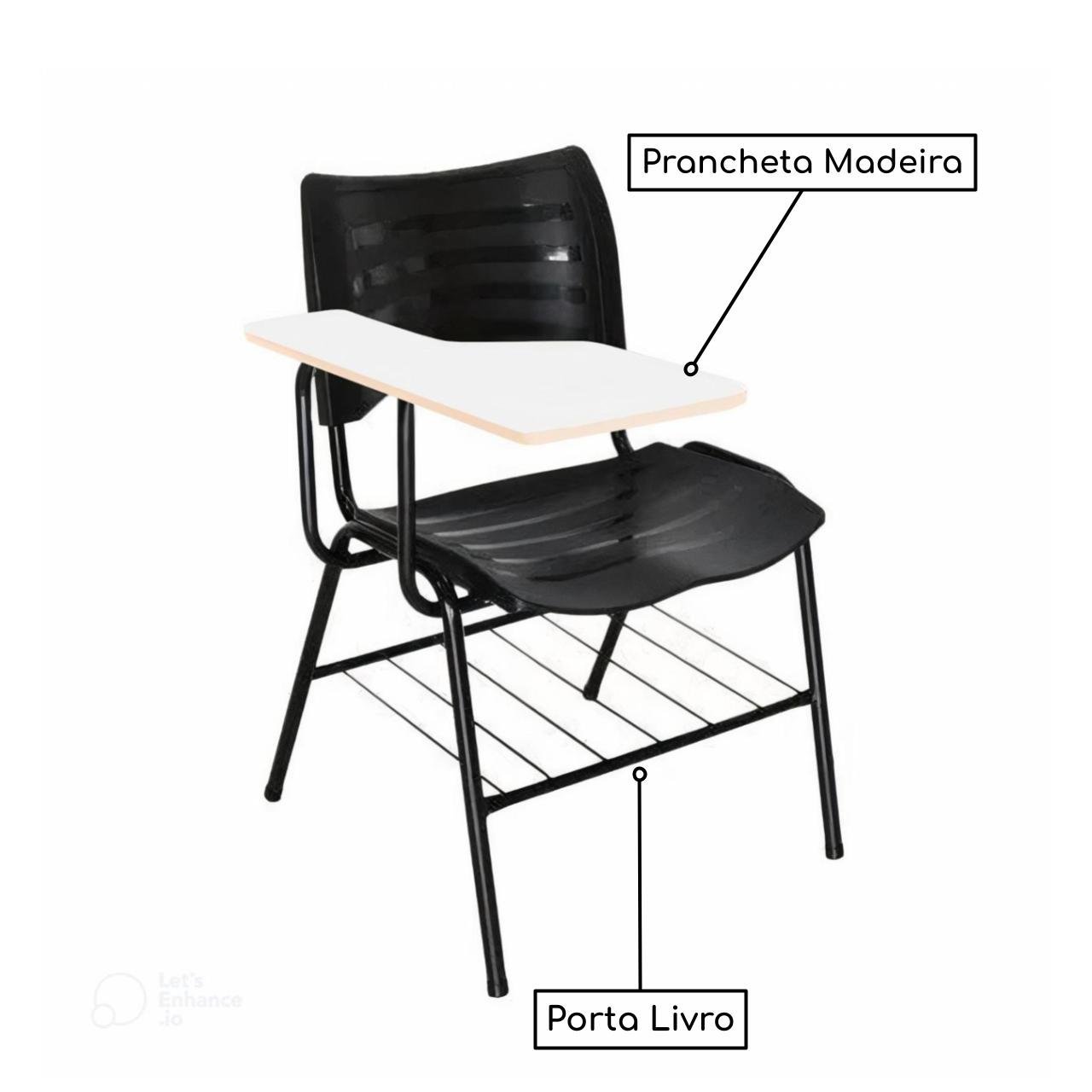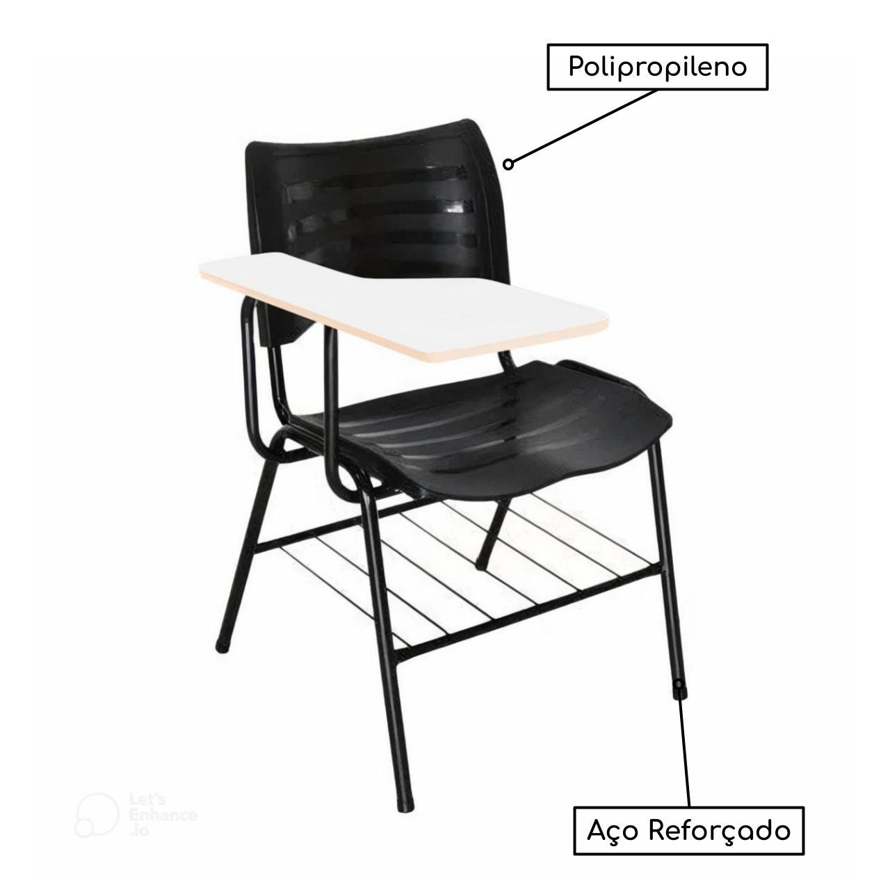 Mais informações: Prancheta em madeira, Assento e encosto em polipropileno, Base de aço com pintura eletrostática (montável), Porta Livros.