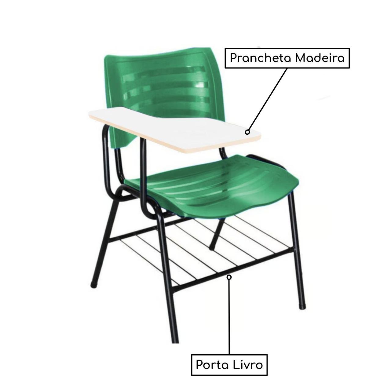 Mais informações: Prancheta em madeira, Assento e encosto em polipropileno, Base de aço com pintura eletrostática (montável), Porta Livros.