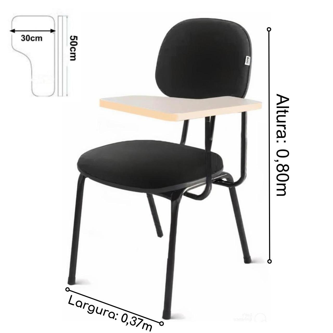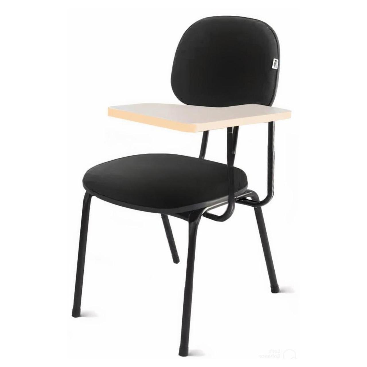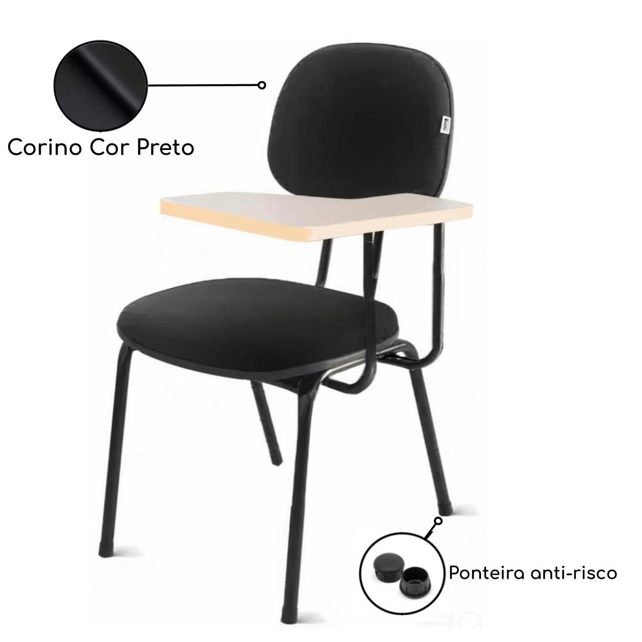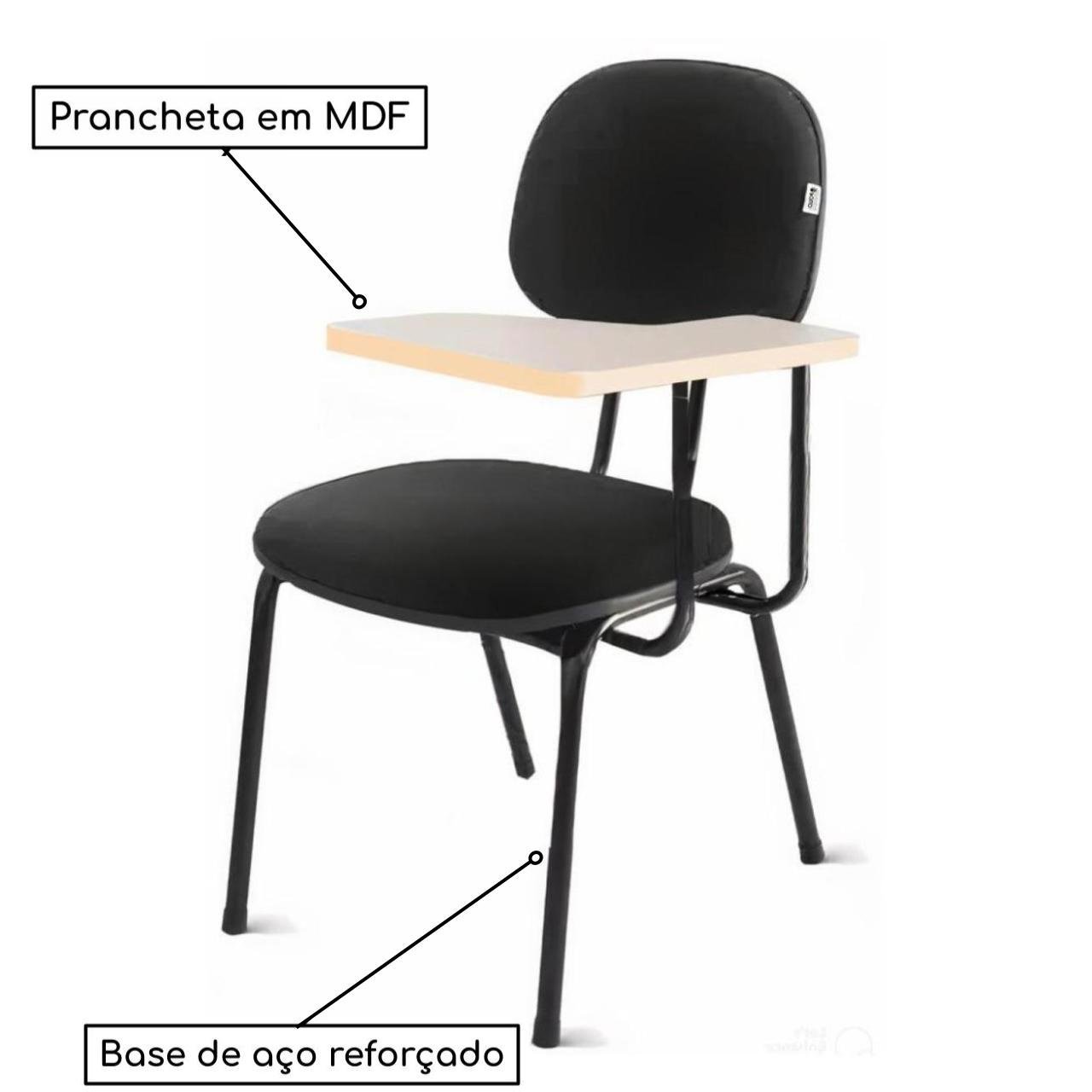 Mais informações: Carteira Universitária, Encosto e assento em corino cor preto, Prancheta em MDF, Base de aço com pintura eletrostática, Modelo para Canhoto