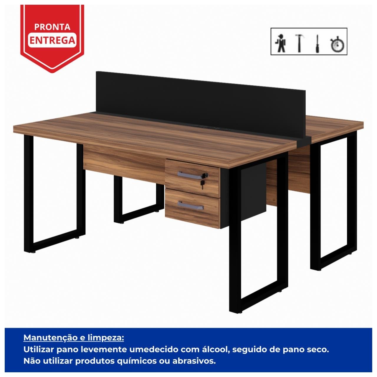 Estação de Trabalho 1,50x1,35m 02 Lugares c/ Gavetas c/ ponto de tomada PÉ QUADRO - Cor Nogal Sevilha - 63099