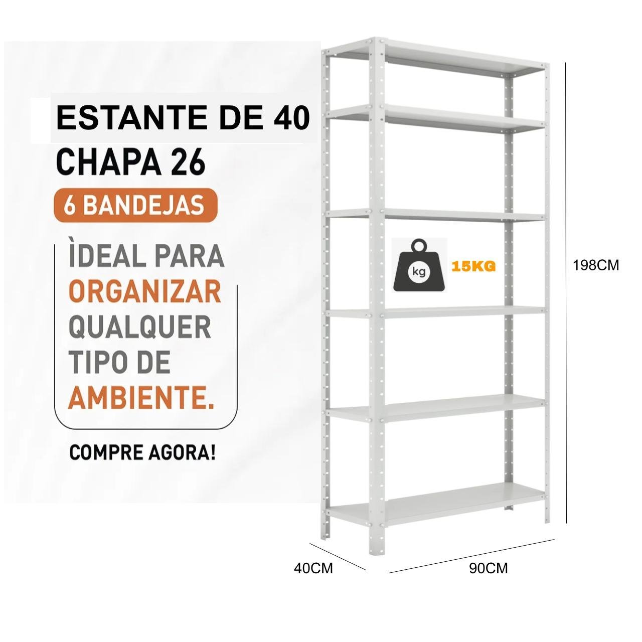 Estante de Aço com 06 Bandejas 40cm (26/20) – 1,98×0,90×0,40m – W3 – Cinza – 17010