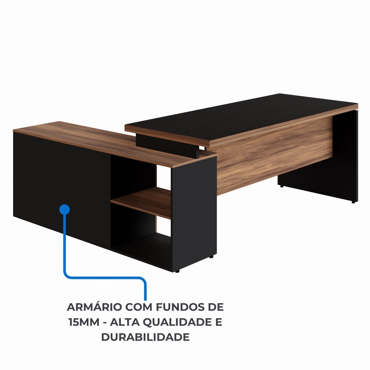 Mesa Diretorzinha c/ vidro c/ Aparador – Pé de MADEIRA – 1,90×1,50m – PMD – NOGAL SEVILHA / PRETO – 21428