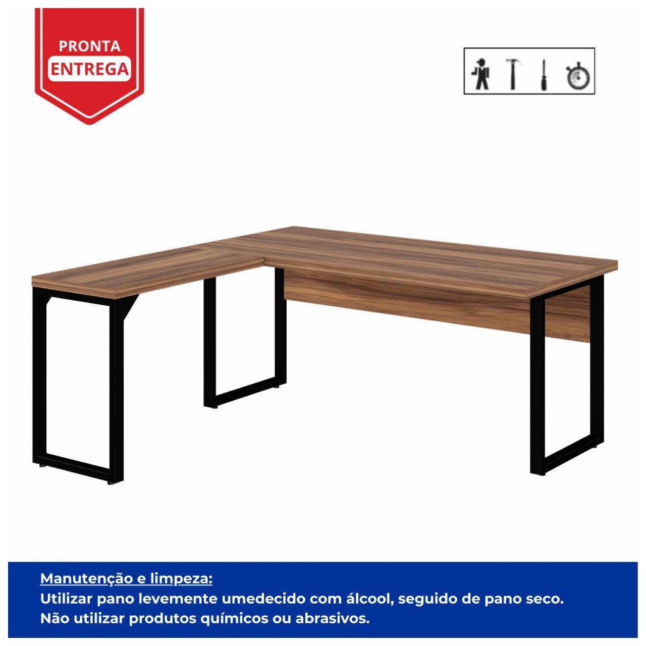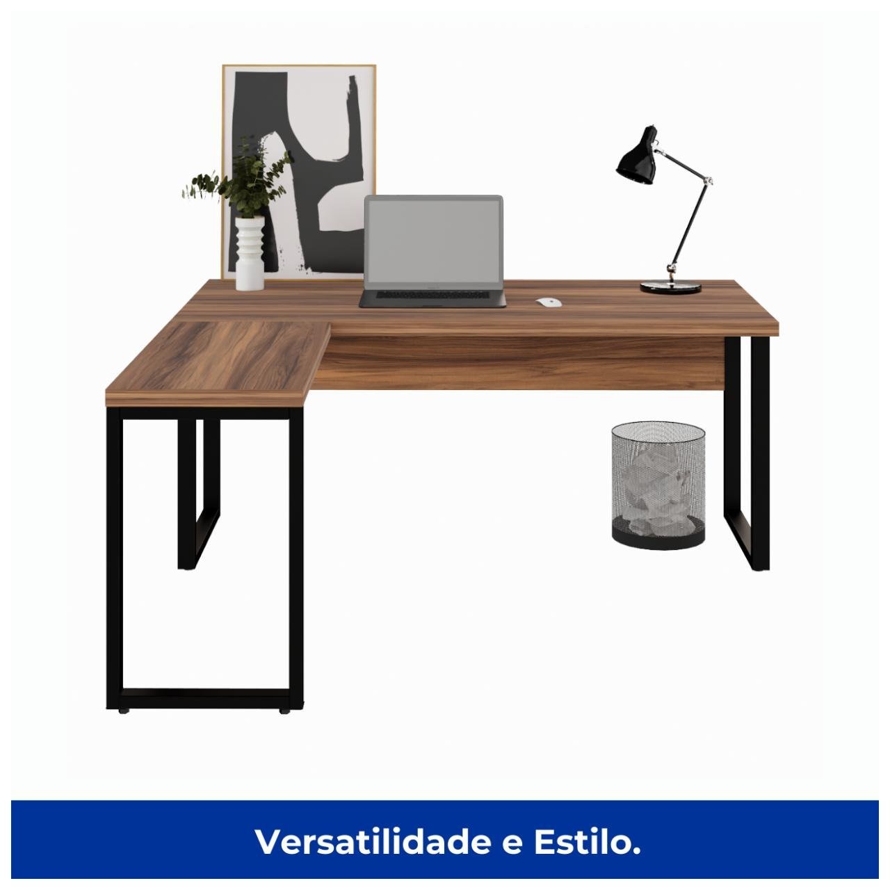 Mesa em L PÉ QUADRO (Mesa 1,70m + Mesa Auxiliar) – S/ Gavetas NOGAL SEVILHA/PRETO – 24478