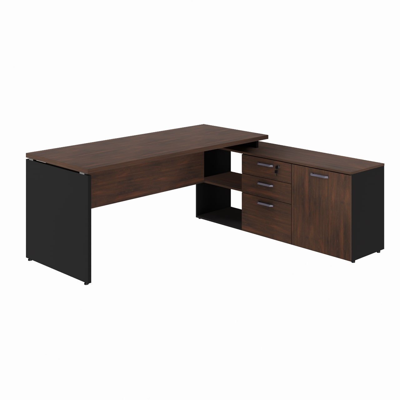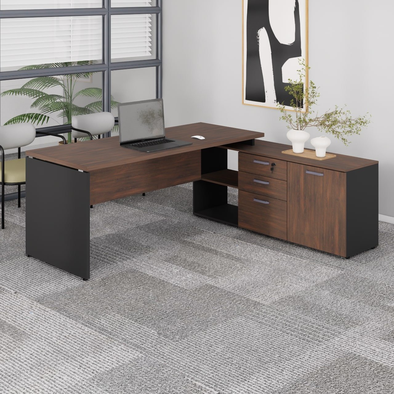 Mesa em “L” robusta, ideal para escritórios executivos, com design imponente, acabamento sofisticado em padrão amadeirado Marsala e estrutura em preto. Acompanha aparador lateral multifuncional com gavetas, armário e nichos abertos, oferecendo excelente espaço para organização.
