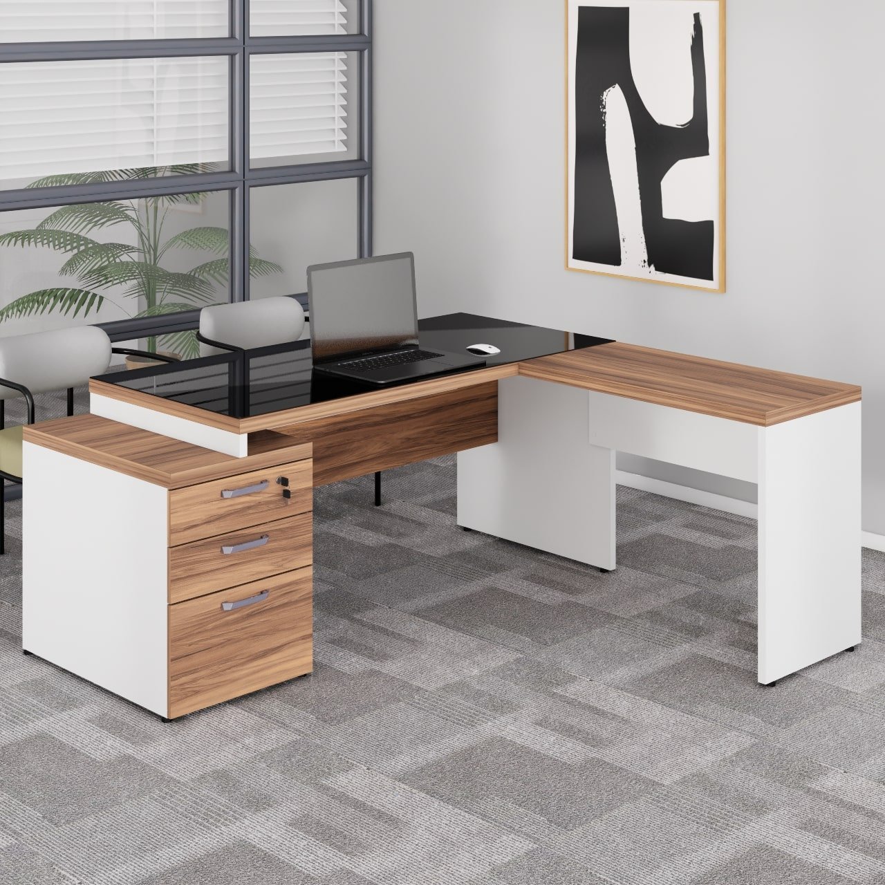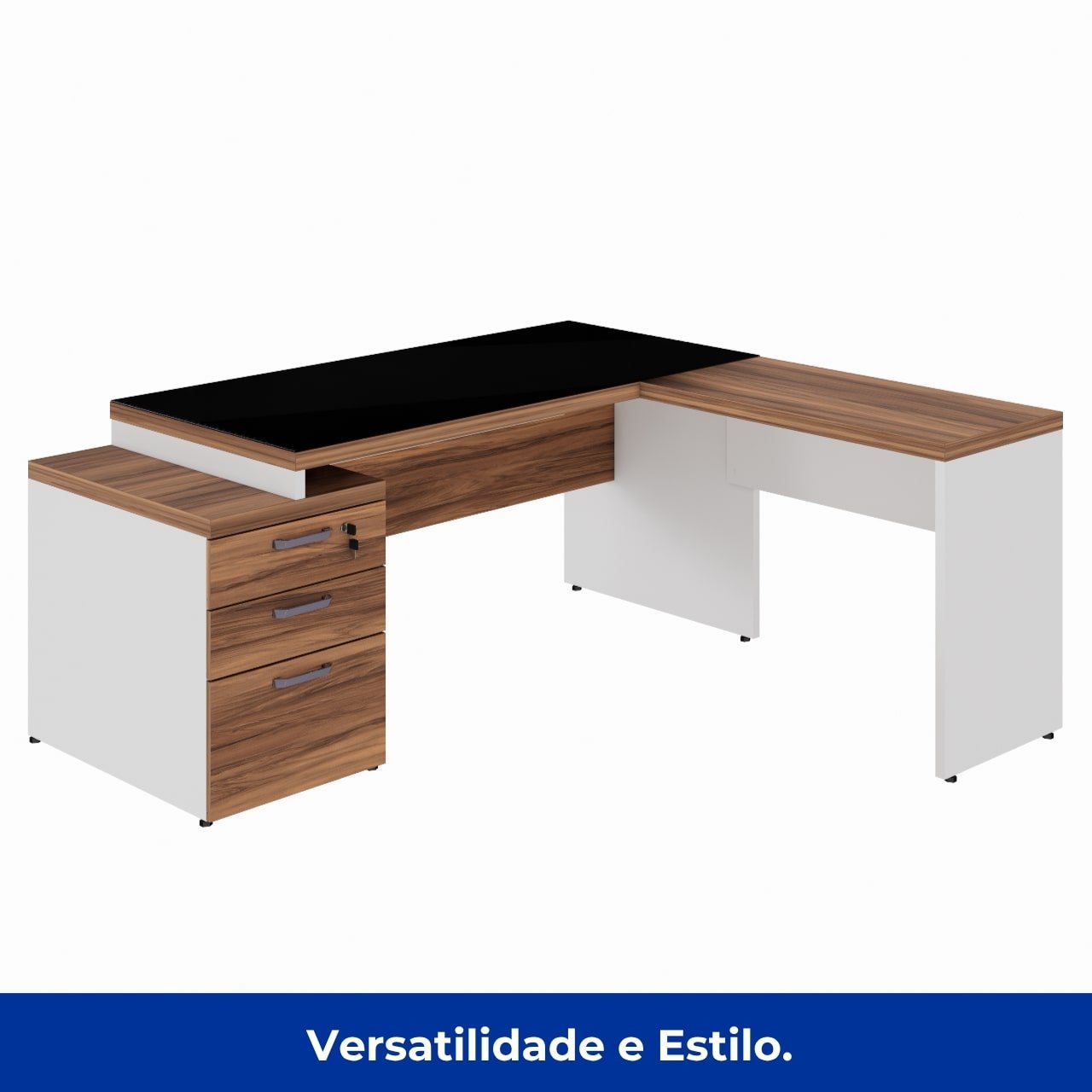 Mesa para Escritório em “L” com VIDRO FUMÊ – 1,92X1,60M NOGAL SEVILHA/BRANCO – 34432