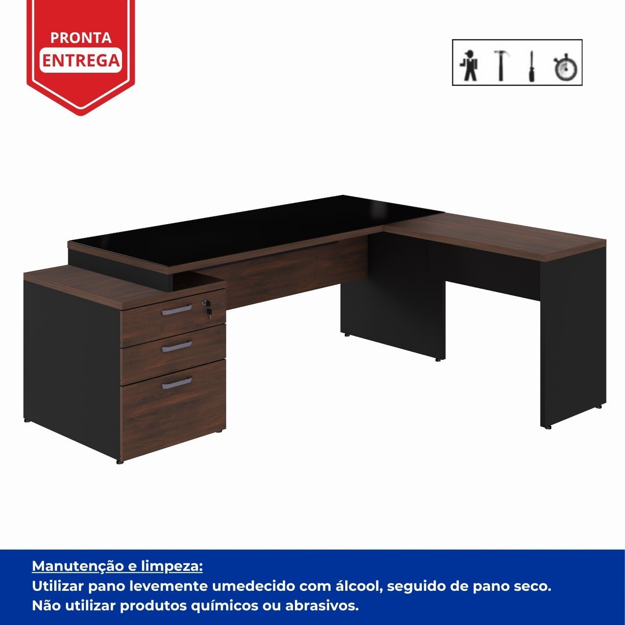 Conteúdo da Embalagem: MESA DIRETOR DINÂMICA COM GAVETEIRO PEDESTAL (02 Gavetas e 01 Pasta) – tampo 1700X700mm / MESA AUXILIAR DINÂMICA / VIDRO TEMPERADO PARA MESA DIRETOR